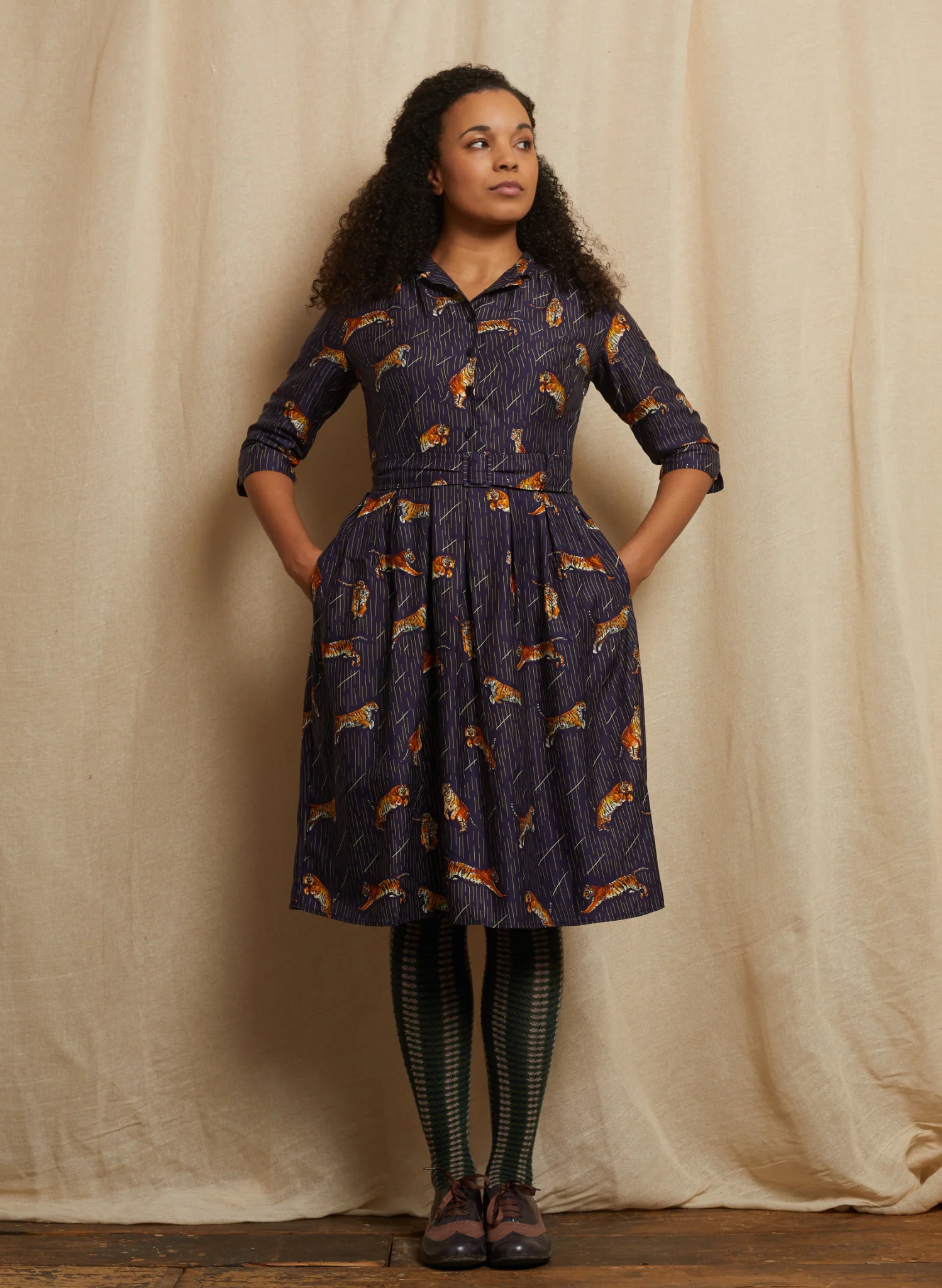 About the Style: Cynthia is the shirt dress of our dreams; featuring a pretty mandarin collar that can be worn up or turned down, three-quarter length sleeves, a belted waist, deep pockets, and a full skirt.