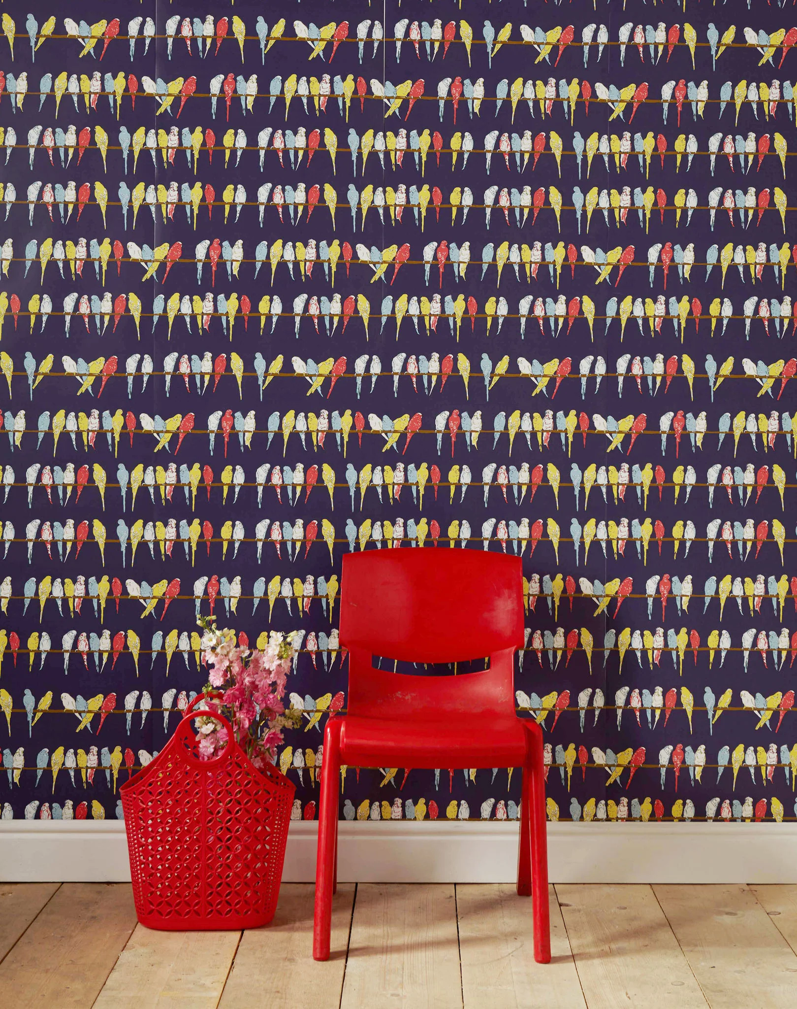 This gorgeous printed wallpaper features a colourful array of budgies all sitting in line!